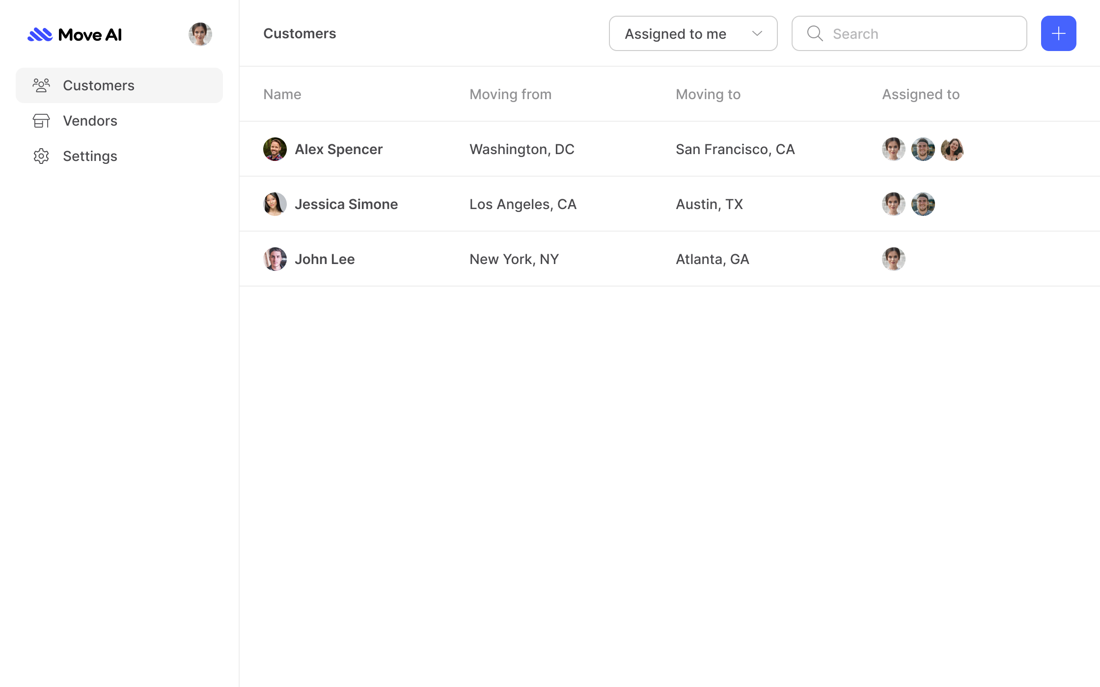 This is the design of a web app that would be used internally by MoveAI administrators and customer support representatives to keep track of all the relocations and talk to users/customers if they need help with anything.