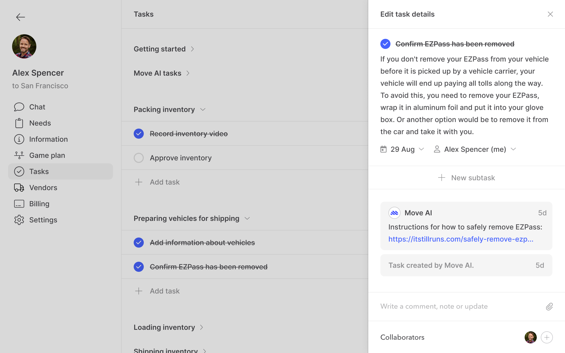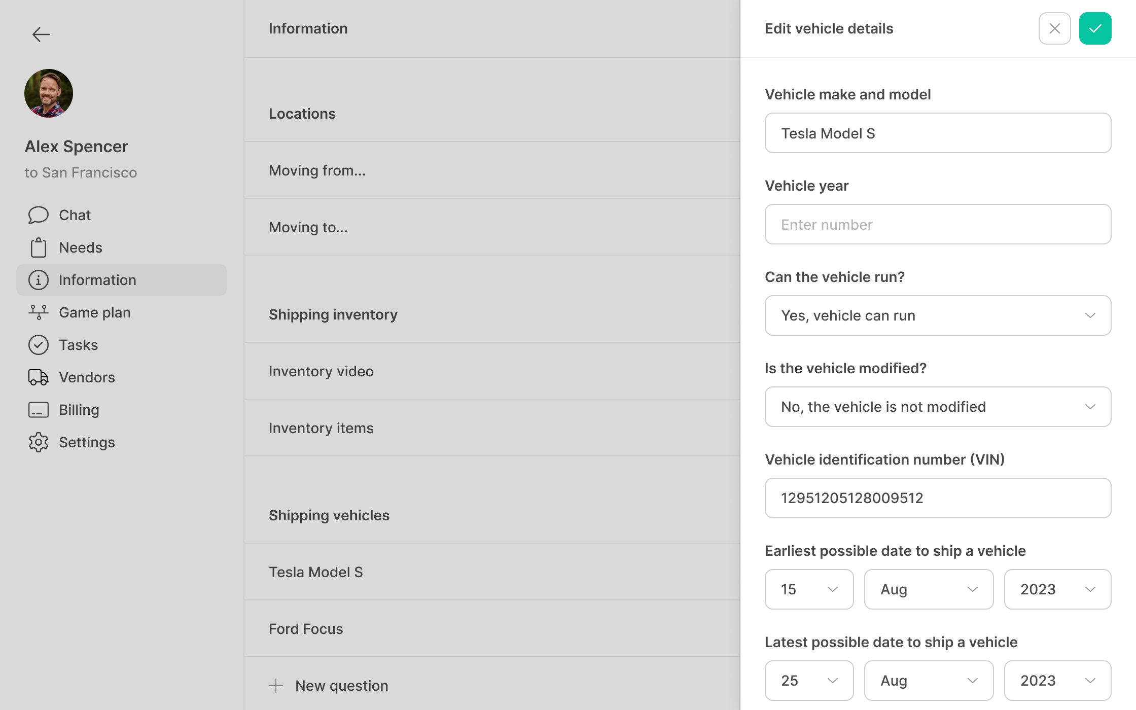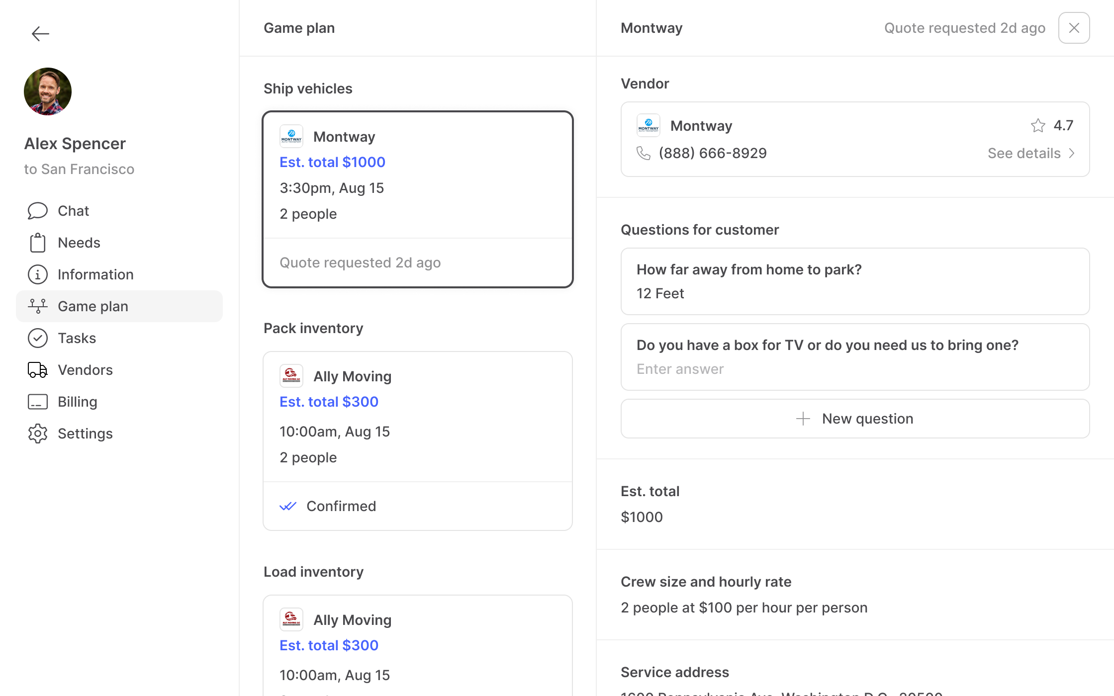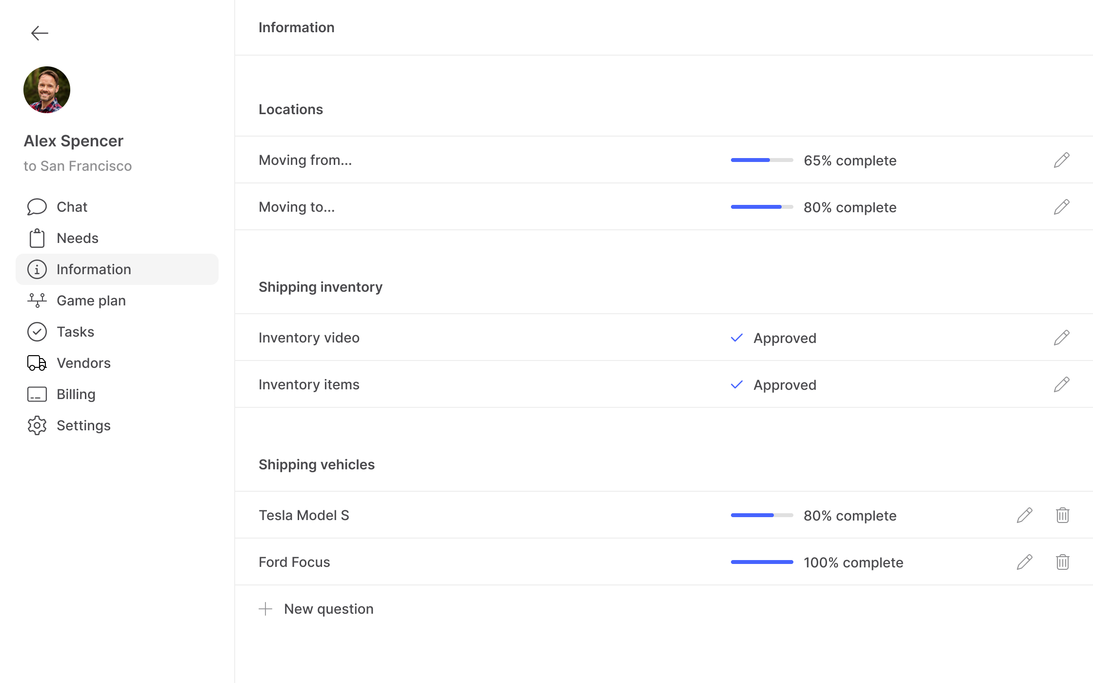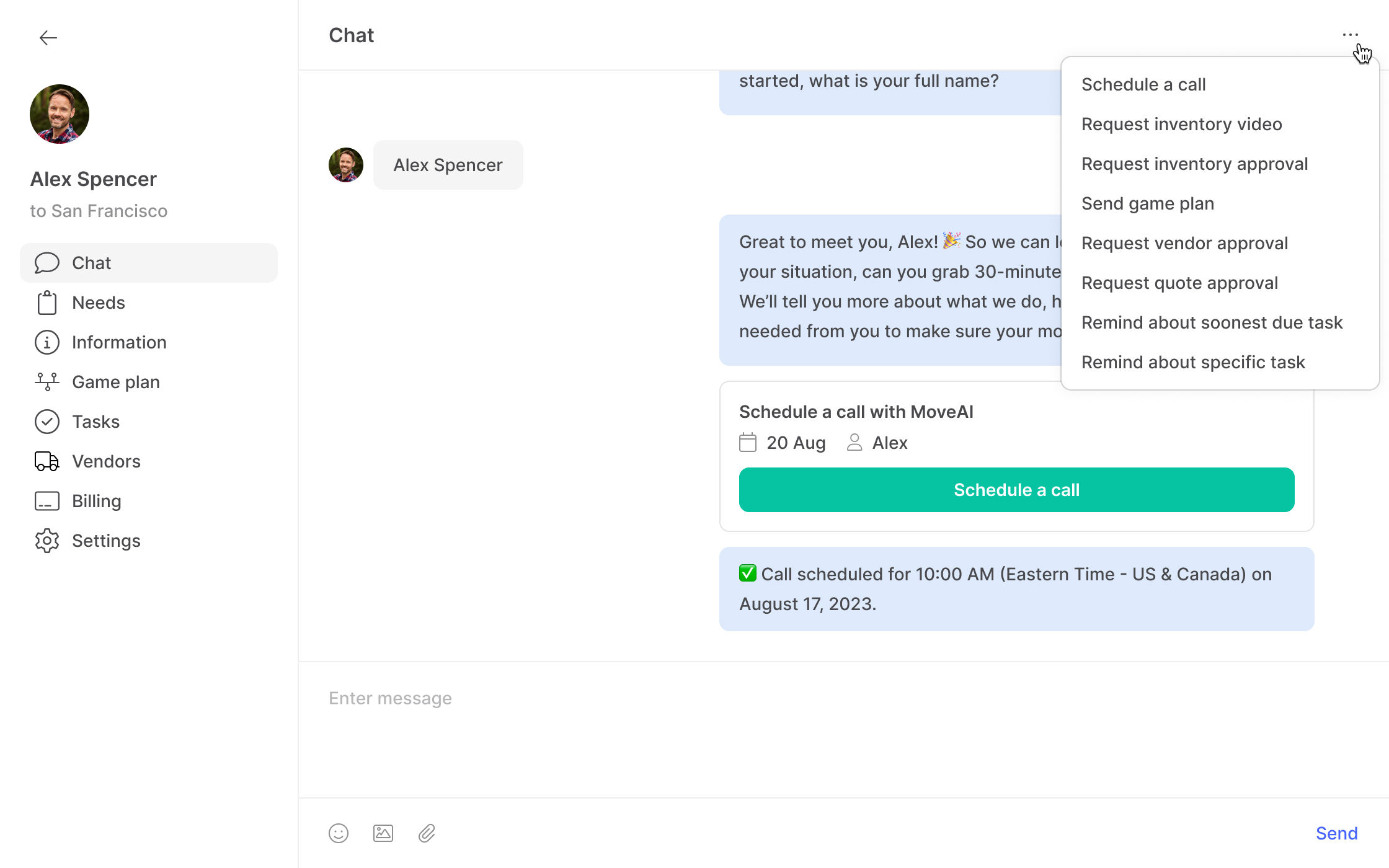 CEO of MoveAI had a somewhat clear idea of how MoveAI should help the user relocate and which features and capabilities to include, so based on the steps that he outlined for me that the AI concierge will take the user through to help fully relocate, he asked me to design the iOS app that the user will use to relocate and the web app that MoveAI agents will use to communicate with users and manage relocations. Basically, he decided on which steps the user has to go through to relocate, and then I had to design a simple app which includes those steps as well as ways to manage tasks, vendor's offers, inventory and invoices. I showed progress on design and improvements to CEO on a daily basis, to review and decide what to implement.
